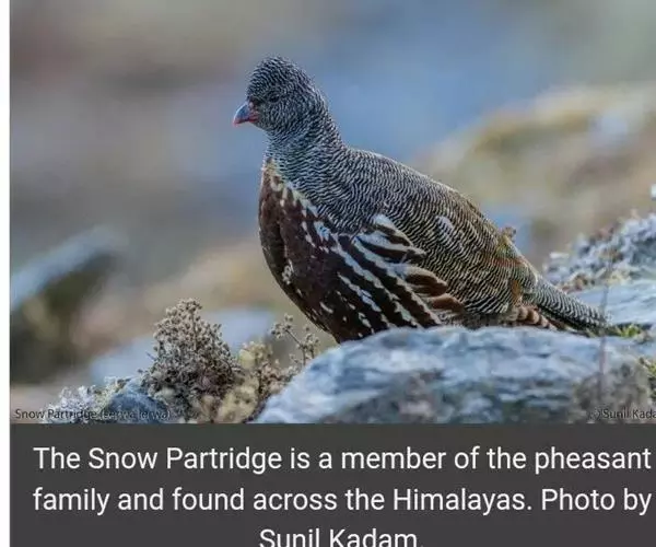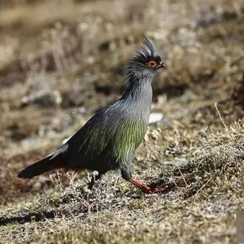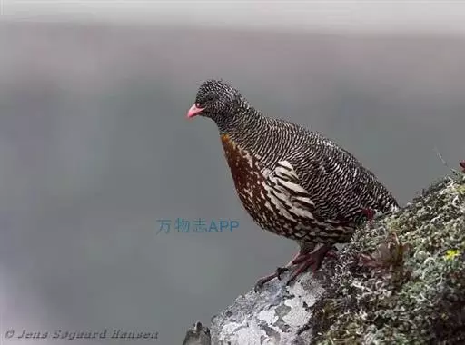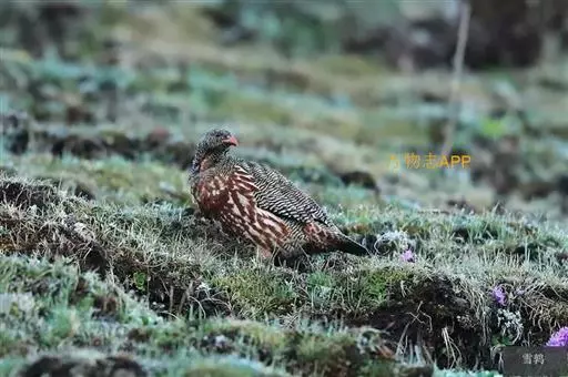 雪鹑(学名:Lerwa lerwa):雄鸟的体长为364毫米,体重560-650克;雌鸟体长310-367毫米,体重420-650克。体羽大都呈黑色与白色,或者黑色与棕色相杂的横斑;飞羽为黑褐色;胸、腹栗色,羽缘具有白斑;尾部有宽度几乎相等的黑白相间的横斑。好像是为了弥补体羽上鲜艳色彩的欠缺,眼睛的虹膜为血红色,嘴和脚更是具有光泽的珊瑚红色。