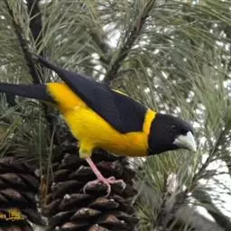 黄颈拟蜡嘴雀:小型鸟类,体长20-22厘米。嘴粗大,黑色。雄鸟整个头、颈、颏、喉和上胸辉黑色,…