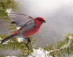 长尾朱雀:体长18厘米,体重16-26克。雄鸟额、颏和眼后为暗红色,…