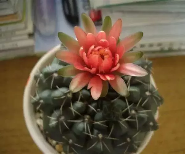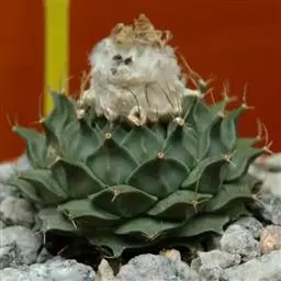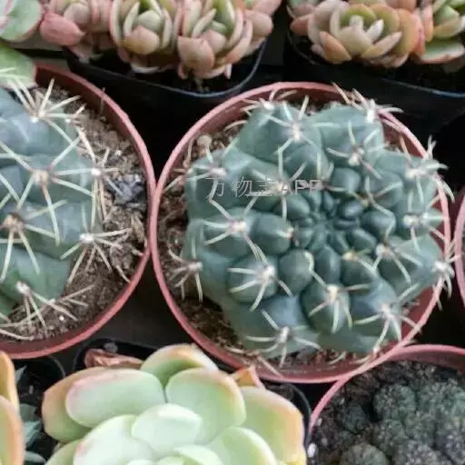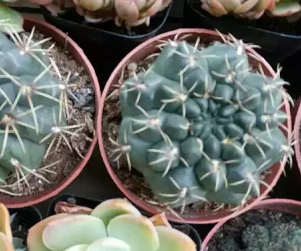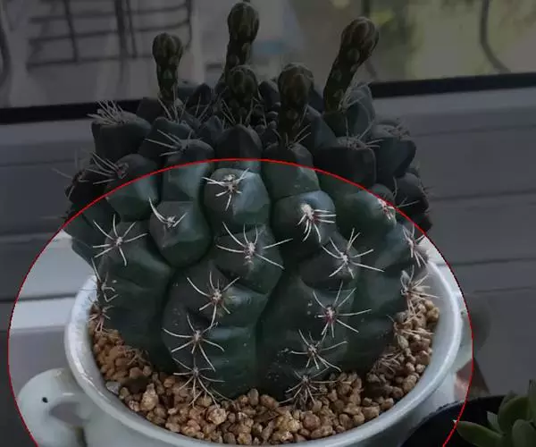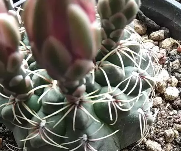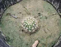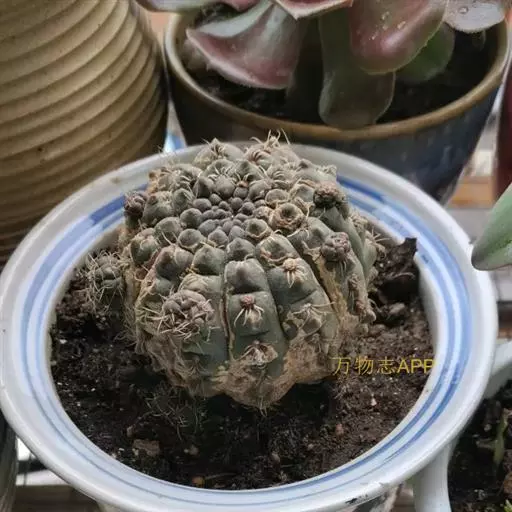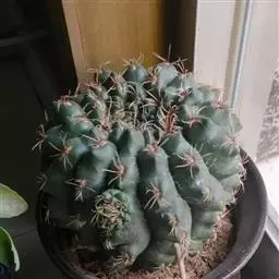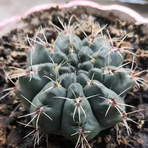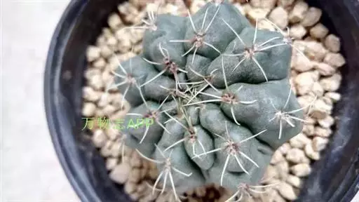 多肉植物,植株呈扁球形,直径7厘米,表皮墨绿色,具棱7-11。刺针状,每个刺座有5枚灰色周刺,中刺1枚,稍粗,灰白或褐色,最长可达1.5厘米。