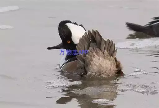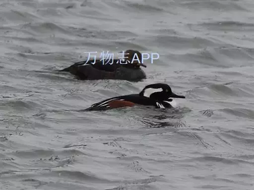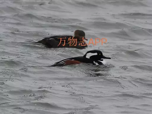 棕胁秋沙鸭体长42-50厘米,翼展56-70厘米。是北美最小的水鸭。雌雄相异形。雄鸭长得相当英俊,有红棕色的庞克(Punk)头,头羽隆成脊状时有大片的白色斑羽和界限分明的黑边,休息时就会变成眼睛背后一种简单的白色宽条纹斑;头部与白帽鹊鸭相似,但身上斑纹较多,总体石板色,有黑色,白色和棕色的羽毛组合。头部,颈部和翕为黑色;臀灰色;尾巴深褐灰色;喉咙,胸部,腹部白色。胸部两侧是黄褐色或红褐并有不规则的黑边纹。