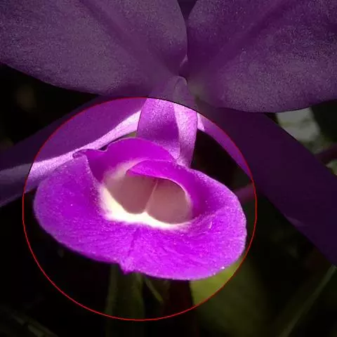 花瓣倒卵状长圆形,长1.2-1.5厘米,宽4.5-7毫米,先端锐尖,具3条脉;唇瓣白色,直立,长约1厘米,分前后唇;后唇半球形,前端密生短流苏,内面密生短毛;前唇淡粉红色,较小,三角形,先端急尖,无毛;蕊柱白色,长约4毫米,下部扩大,具长约2毫米的蕊柱足;蕊柱齿三角形,先端稍钝;药帽紫色,半球形,密布细乳突,前端边缘啮蚀状。花期5-6月。