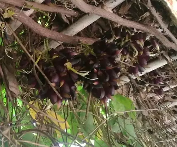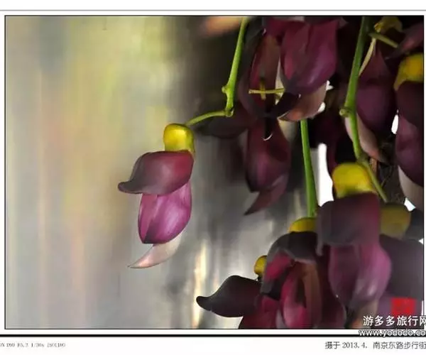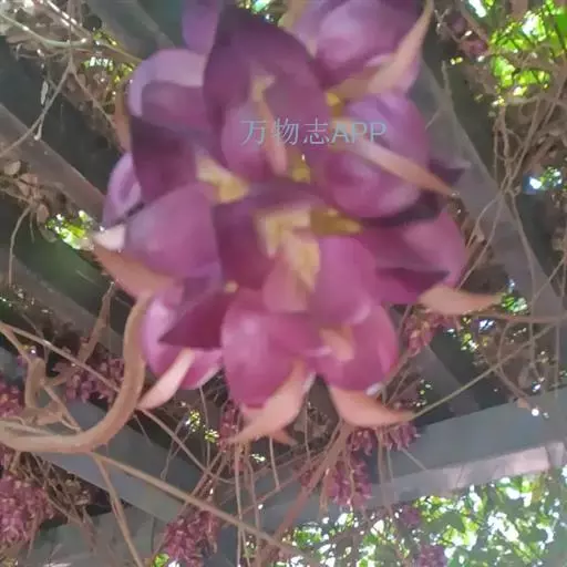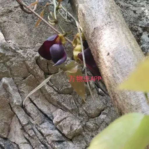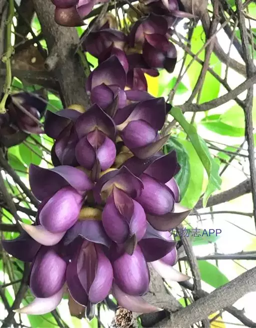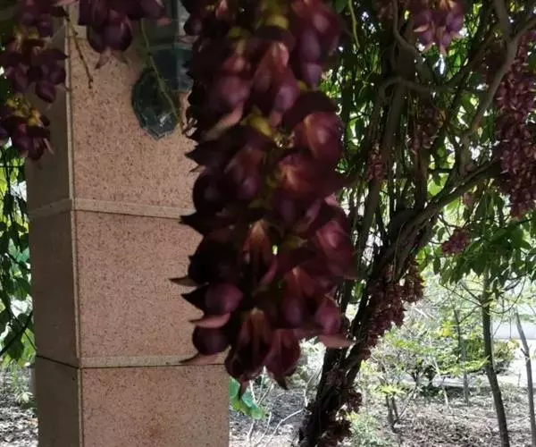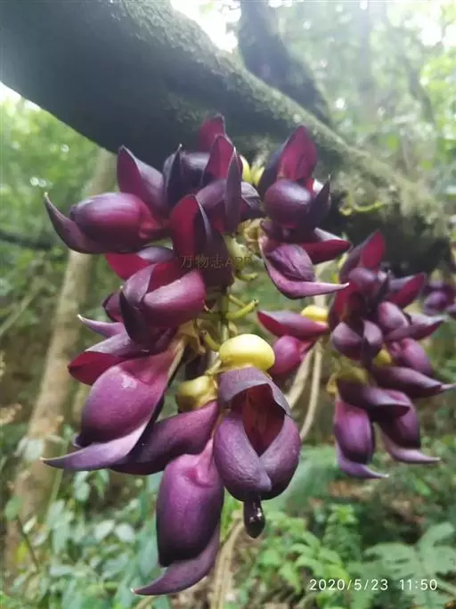 总状花序生于老茎上,长10-36厘米,每节上有3花,无香气或有臭味;苞片和小苞片不久脱落,苞片狭倒卵形,长宽各15毫米;花梗长1-2.5厘米,具短硬毛;小苞片卵形或倒卵形;花萼密被暗褐色伏贴短毛,外面被稀疏的金黄色或红褐色脱落的长硬毛,萼筒宽杯形,长8-12毫米,宽18-25毫米;花冠深紫色,干后黑色,长约6.5厘米,旗瓣长3.2-4厘米,圆形,先端凹达4毫米,基部耳长1-2毫米,翼瓣长4.8-6厘米,宽1.8-2厘米,龙骨瓣长6-7厘米,基部瓣柄长约7毫米,耳长约4毫米;雄蕊管长约4厘米,花柱下部和子房被毛。