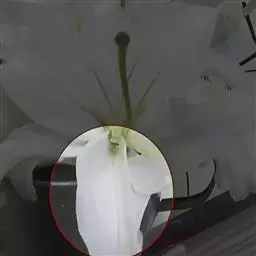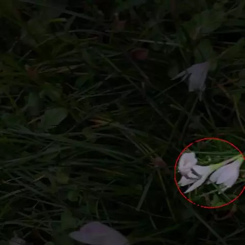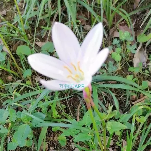 花茎中空;花单生于花茎顶端,下有带褐红色的佛焰苞状总苞,总苞片顶端2裂;花梗长约1厘米;花白色,外面常带淡红色;几无花被管,花被片6,长3-5厘米,顶端钝或具短尖头,宽约1厘米,近喉部常有很小的鳞片;雄蕊6,长约为花被的1/2;花柱细长,柱头不明显3裂。