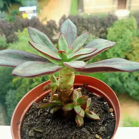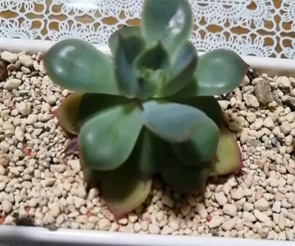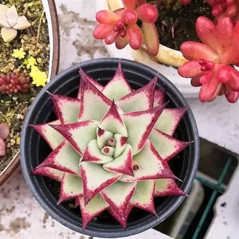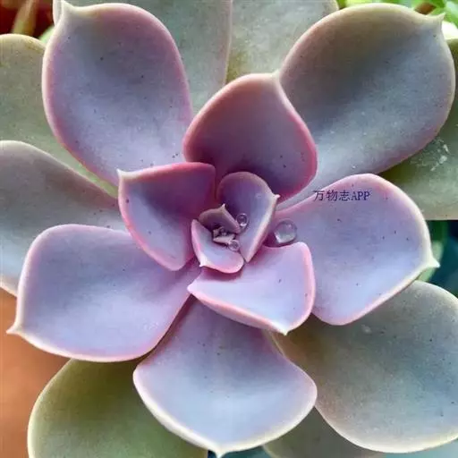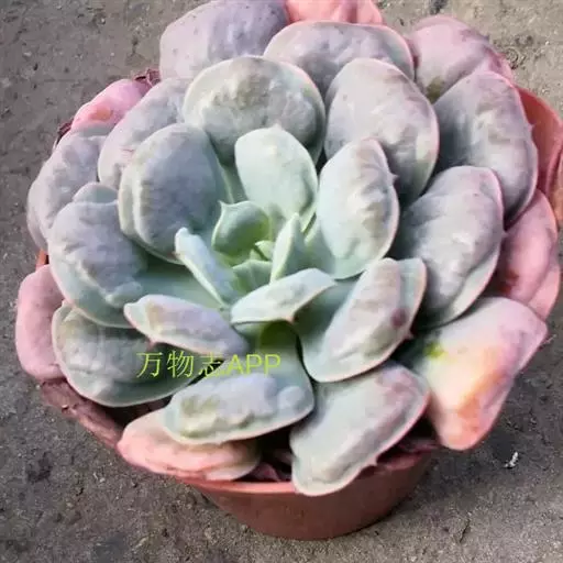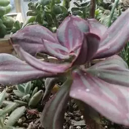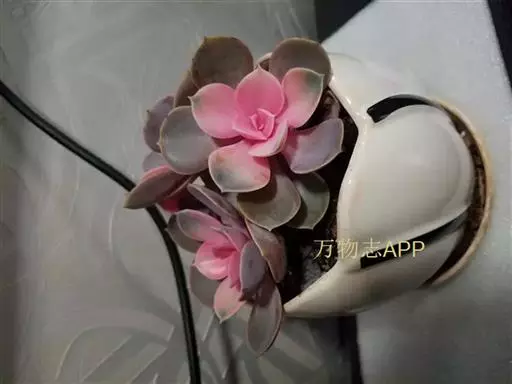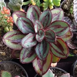 生长时绿色为主,紫色不明显,入秋后日夜温差拉大,叶片呈现美丽的粉紫色,叶缘呈白色。叶片呈莲座形螺旋排列,秋冬季观赏性最佳。放置在阳光下的话,会长成玫瑰花瓣状,使得这个品种具有非常强的观赏性。