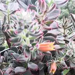 紫珍珠有一个可爱的肉质银色的光泽,并随着季节变化色调的紫红色的叶子,称得上是最美的多肉植物之一。紫珍珠花是精致的珊瑚色系,通常一个花穗上回有十几个甚至更多的小花朵。至秋凉后,在光照下紫色才渐渐加深、凸现。夏末秋初,从叶腋间抽出花茎,开略带紫色的橘红色花朵。
