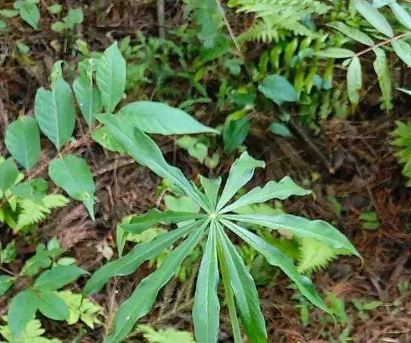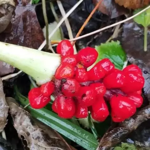 为天南星科天南星属的植物,有毒。多年生草本。块茎略呈球形,直径可达6厘米。叶1枚,小叶7~23枚,呈辐射状排列,形如一把伞,顶端细丝状,叶柄长,长40~80厘米。5~7月开花,雌雄异株,花序的佛焰苞为绿色或淡紫色,有白色条纹,肉穗花序的附属器棒状,顶端钝。浆果多数,成熟时为鲜红色。