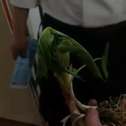 块茎扁球形,直径可达6厘米,表皮黄色,有时淡红紫色。鳞叶绿白色、粉红色、有紫褐色斑纹。叶1,极稀2,叶柄长40-80厘米,中部以下具鞘,鞘部粉绿色,上部绿色,有时具褐色斑块;叶片放射状分裂,裂片无定数;幼株少则3-4枚,多年生植株有多至20枚的,常1枚上举,余放射状平展,披针形、长圆形至椭圆形,无柄,长(6-)8-24厘米,宽6-35毫米,长渐尖,具线形长尾(长可达7厘米)或否。