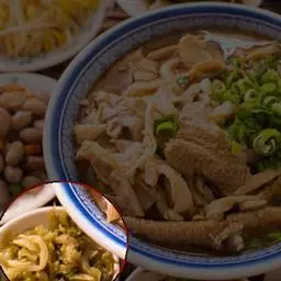 5.食用时先将整羊卧放于特制的木盘内,羊角系上红绸布,抬至餐室请宾客欣赏后,由厨师将羊皮剥下切成条装盘,再将羊肉割下切成厚片,羊骨剁成大块分别装盘,配以葱段、蒜泥、面酱、荷叶饼,并随带蒙古刀上桌。