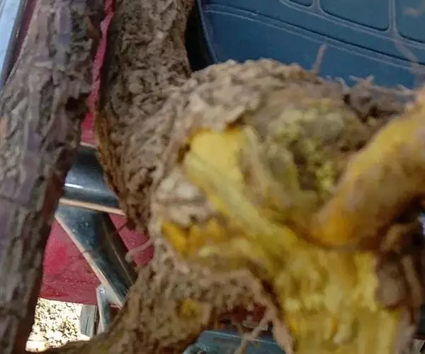 4.将全羊腹朝上挂入提前烧热的烤炉内,将炉口用铁锅盖严,并用黄泥封好,在炉的下面备一铁盒,用来盛装烘烤时流出的羊油,大约3~4小时,待羊皮烤至黄红酥脆,肉质嫩熟时取出。