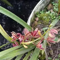 莲瓣兰叶片主脉两侧分别有一条侧脉,侧脉明亮,侧脉边缘呈暗绿色,在侧脉与主脉之间,侧脉与叶缘之间还有两条次侧脉,但用肉眼看不显。莲瓣兰叶片润而光亮。叶片叶质细腻,富弹性,鞘壳紧抱叶脚,株形紧凑。一葶着花2~5朵,幽香,花色鲜丽。