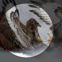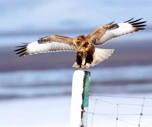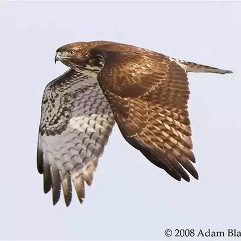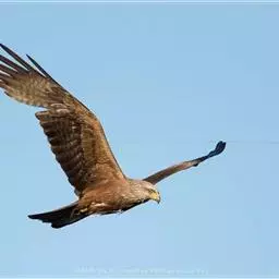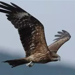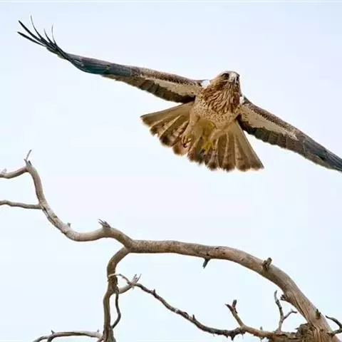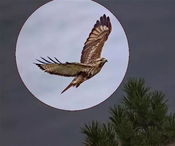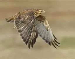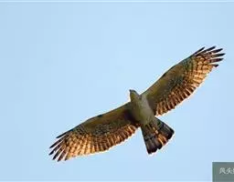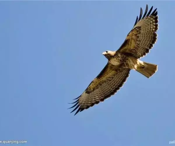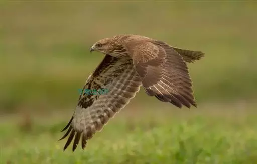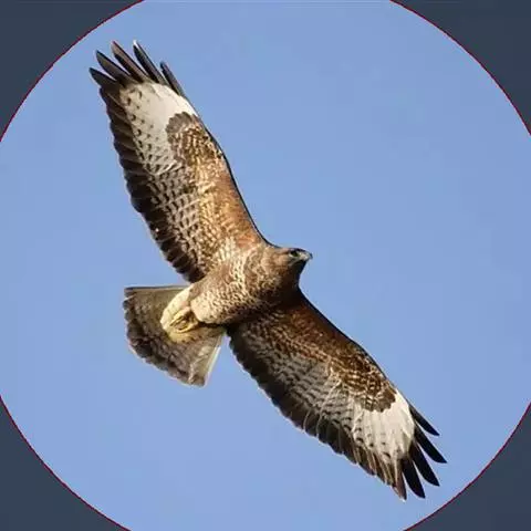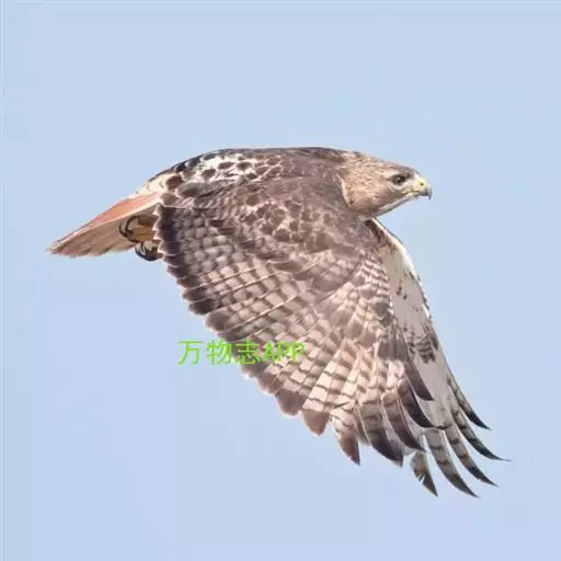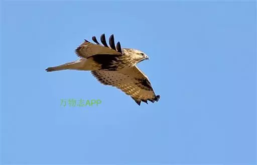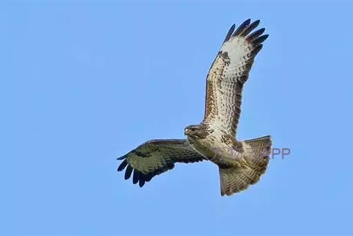 普通鵟(学名:Buteo buteo)属中型猛禽,体长50-59厘米。体色变化较大,上体主要为暗褐色,下体主要为暗褐色或淡褐色,具深棕色横斑或纵纹,尾淡灰褐色,具多道暗色横斑。飞翔时两翼宽阔,初级飞羽基部有明显的白斑,翼下白色,仅翼尖、翼角和飞羽外缘黑色 (淡色型)或全为黑褐色 (暗色型),尾散开呈扇形。翱翔时两翅微向上举成浅‘V’字形。