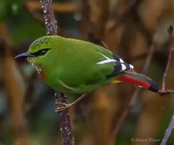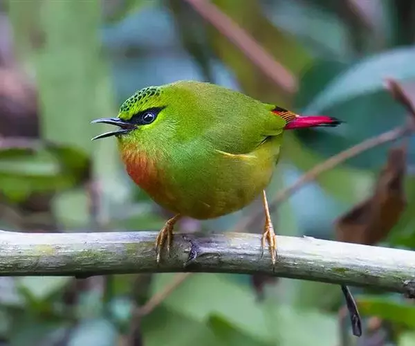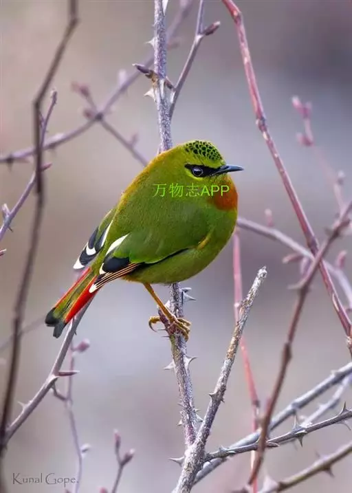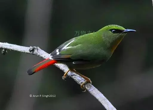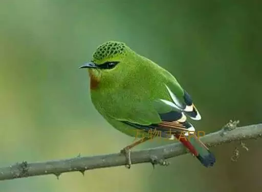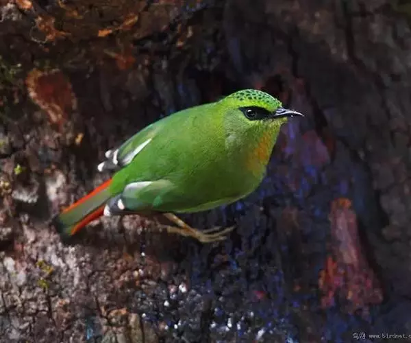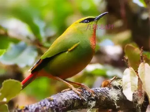 火尾绿鹛(图2) 雄性成鸟:体色一般为有光泽的橄榄黄色,眼先和眼后黑色,眉纹黄绿色;头顶羽毛中央有卵圆形黑斑,构成鳞片状的斑纹;翅上覆羽和尾上覆羽与背部相似,均为橄榄黄色;初级飞羽褐色,外翈深黑色,从第三或第四枚起,端部边缘浅肉黄色,内翈顶端白色;外侧次级飞羽褐色,外翈边缘暗朱红色,向端部渐变为橘黄色和白色,构成朱红色翼镜,最内侧次级飞羽内翈绿色,类似背部,外翈黑色;尾羽暗灰色,顶端微黑色,外翈红色,中央一对尾羽内翈绿色;喉和上胸棕红色;腹部和尾下覆羽棕黄色。 雌性成鸟:与雄鸟相似,但各部羽色较雄体暗些;头顶和背部橄榄绿色;翼镜不为朱红色,而是面积较小的褐黄色;其他各羽片颜色都较雄鸟淡些;翅端白色也较雄鸟面积小;喉部和尾下覆羽淡褐色;下体余部暗绿色微沾黄色。 虹膜红色或红褐色;嘴黑褐色;跗踱肉红色。