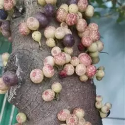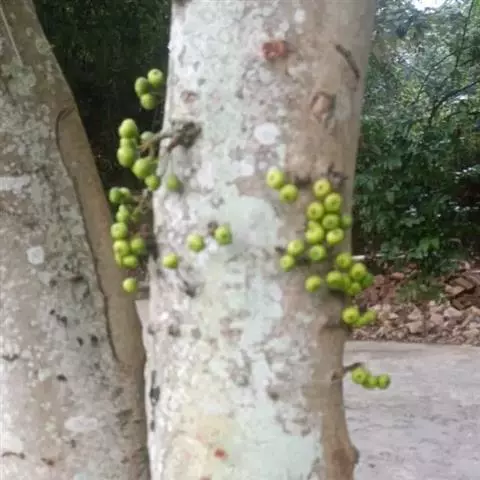 大乔木,高达20米,胸径30-50厘米,树冠广阔;树皮灰色,平滑;小枝下垂。叶薄革质,卵形至卵状椭圆形,长4-8厘米,宽2-4厘米,先端短渐尖,基部圆形或楔形,全缘,一级侧脉与二级侧脉难于区分,平行展出,直达近叶边缘,网结成边脉,两面光滑无毛;叶柄长1-2厘米,上面有沟槽;托叶披针形,长约6毫米。榕果成对或单生叶腋,基部缢缩成柄,球形或扁球形,光滑,成熟时红色至黄色,直径8-15厘米,基生苞片不明显;雄花、瘿花、雌花同生于一榕果内;雄花极少数,具柄,花被片4,宽卵形,雄蕊1枚,花丝短;瘿花具柄,多数,花被片5-4,狭匙形,子房卵圆形,光滑,花柱侧生;雌花无柄,花被片短匙形。瘦果卵状肾形,短于花柱,花柱近侧生,柱头膨大。花期8-11月。 [1-2]