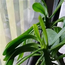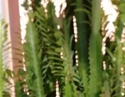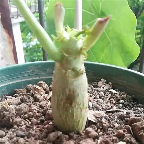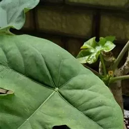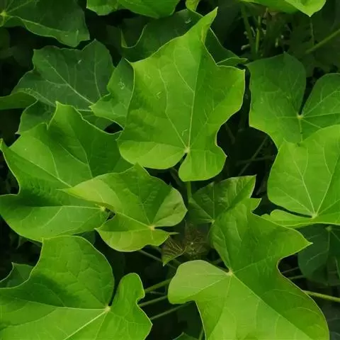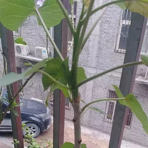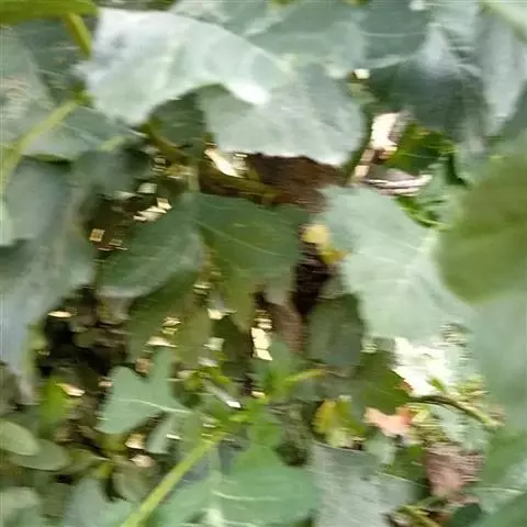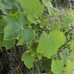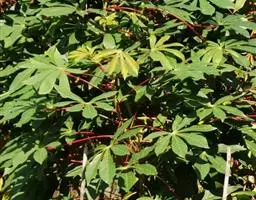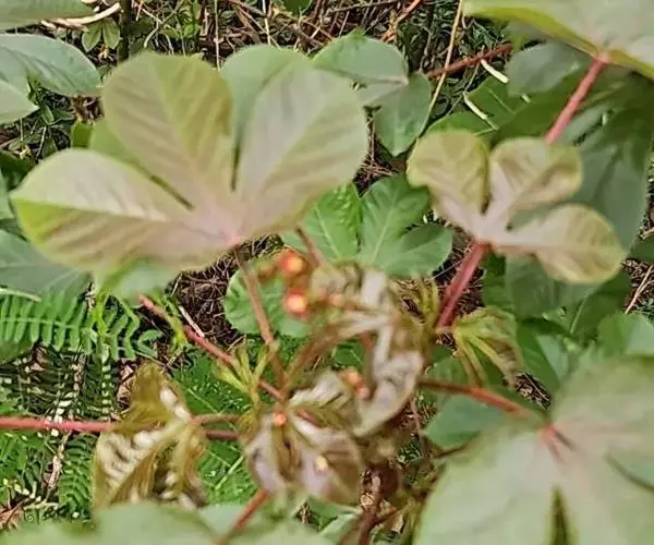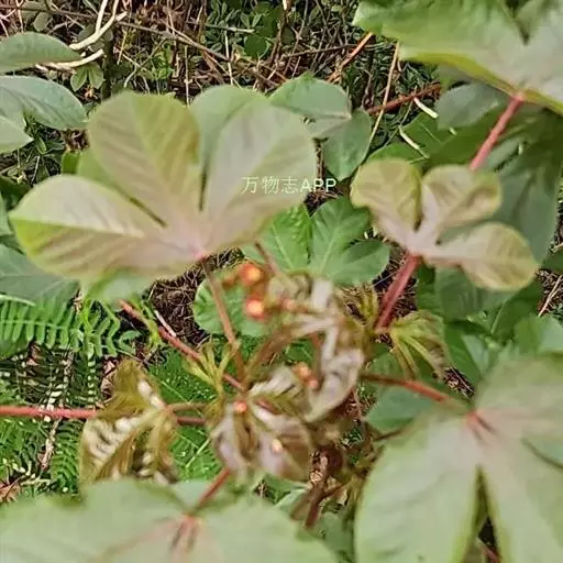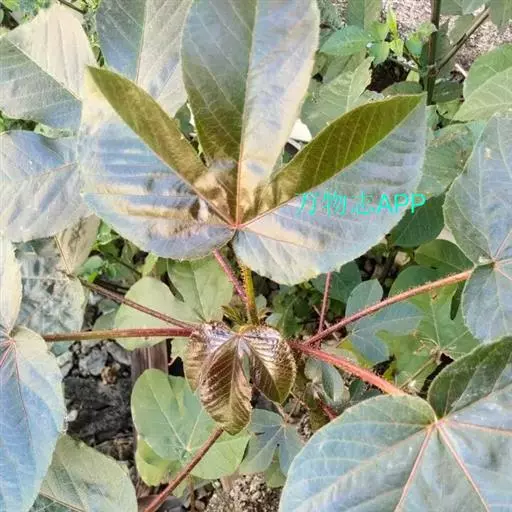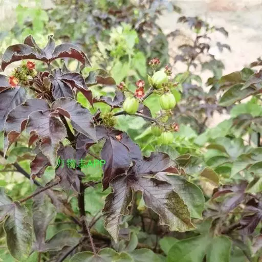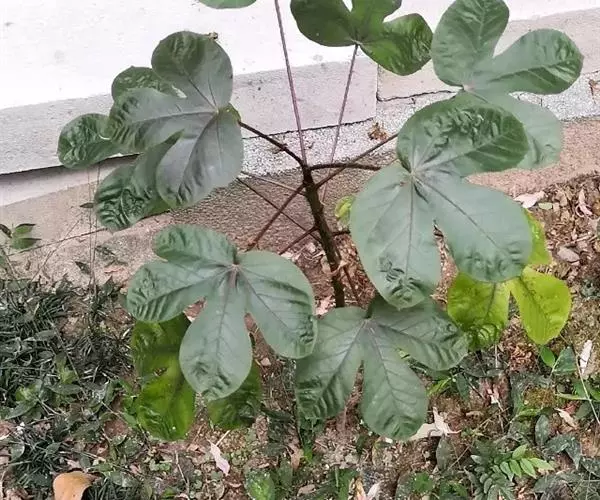 多年生落叶灌木或小乔木,株高2~6米。树皮光滑,苍白色;具乳汁,无毛。全株有毒。嫩叶紫红色,渐变绿色;叶背紫红色。单叶互生,近革质,掌状深裂3或4,裂片线状披针形或羽状,叶缘具锯齿,叶柄长10~25厘米,具刚毛,紫红色;托叶细裂为刚毛状,长约2厘米。