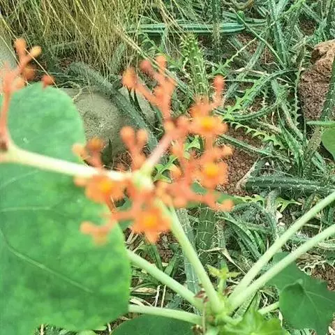 花红色,雄花花瓣长约4毫米,雌花花瓣长约6~7毫米。聚伞花序,腋生;花总梗长,被毛,中部以上分枝。雄花萼长2~3毫米,裂片5枚,近圆形,无毛;雌花萼同;雄花瓣5枚,匙形;雌花同;花单性,雌雄同株;花期7~12月。开花时往往雄花多,雌花少。