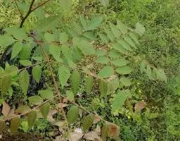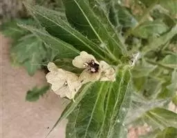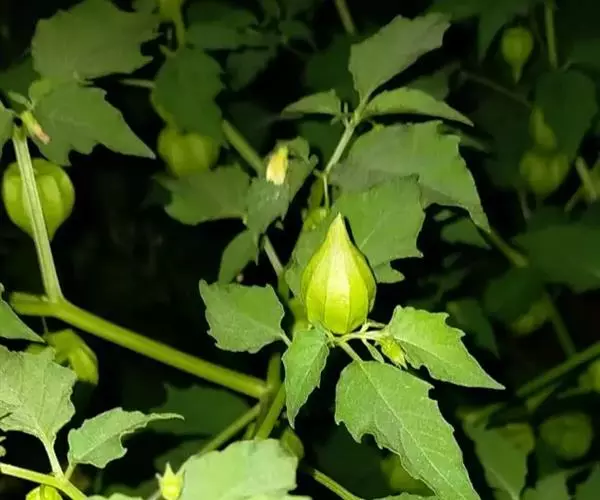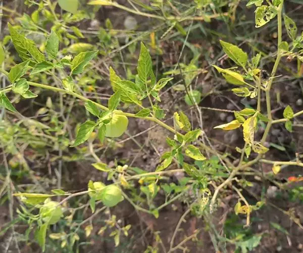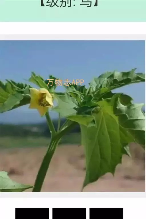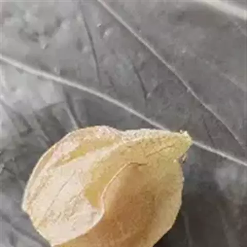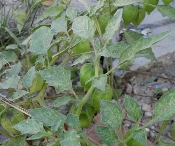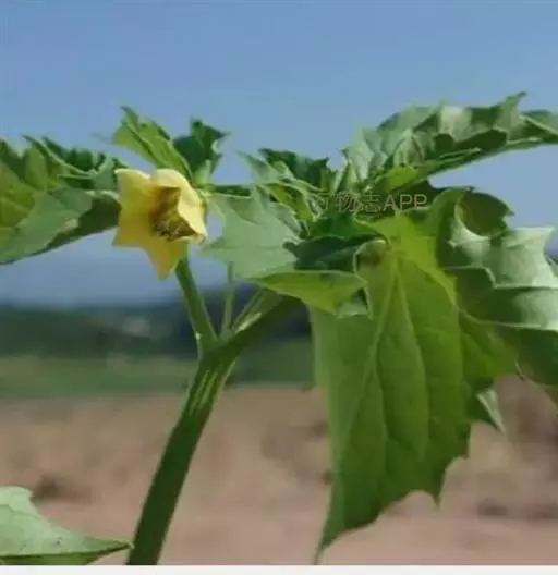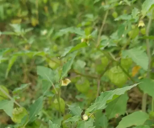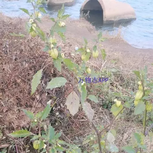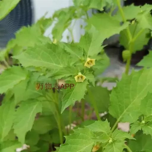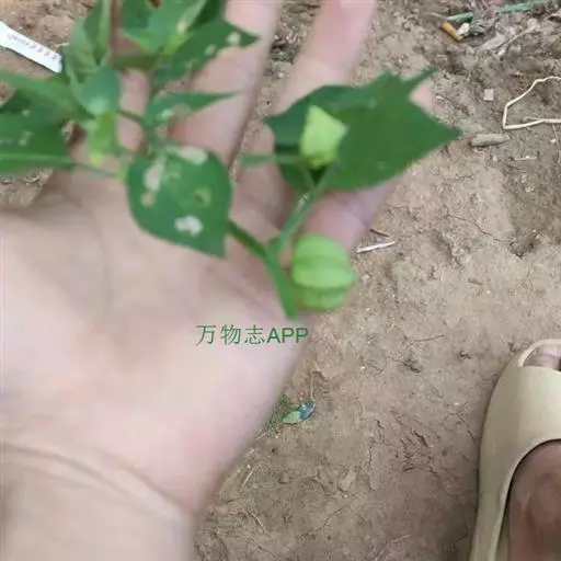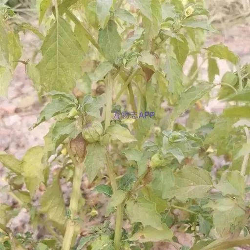 茎有分枝,具细柔毛或近光滑,叶互生,黄绿色,多皱缩或脱落,完整者卵形,长3-6cm,宽2-4cm(用水泡开后展平),先端渐尖,基部偏斜,全缘或有疏锯齿,厚纸质;叶柄1-3cm。花淡黄棕色,钟形,先端5裂。有的可见果实,球形,橙红色,外包淡绿黄色膨大的宿萼,长约2.5cm,有5条较深的纵棱。气微,味苦。