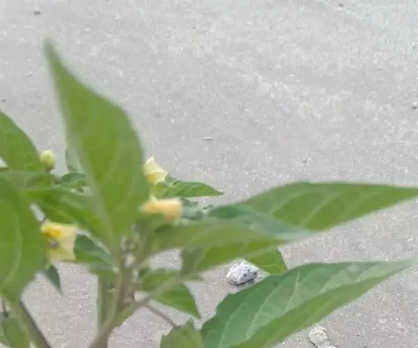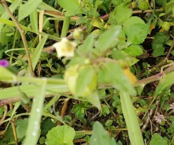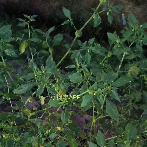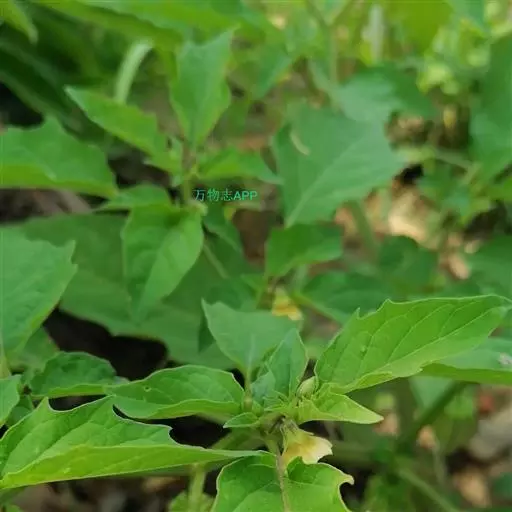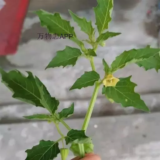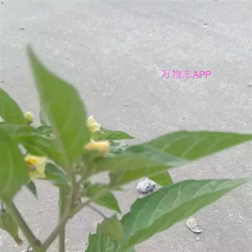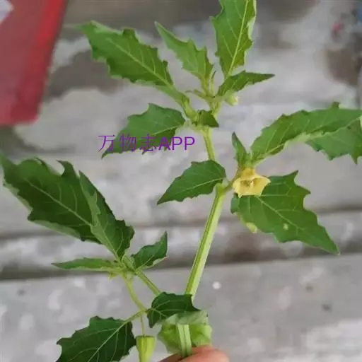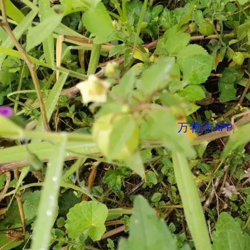 一年生草本,被疏短柔毛或近无毛,高常30-50厘米;茎多分枝,分枝纤细。叶柄长1-5厘米,叶片卵形至卵状椭圆形,顶端渐尖或急尖,基部阔楔形或楔形,全缘或有不等大的牙齿,两面近无毛,长3-6厘米,宽2-4厘米。花梗长约5-12毫米,纤细和花萼一样生短柔毛,长4-5毫米,5中裂,裂片披针形,生缘毛;花冠淡黄色,喉部常有紫色斑纹,长4-6毫米,直径6-8毫米;花药蓝紫色或有时黄色,长约1.5毫米。果萼卵球状,直径1.5-2.5厘米,薄纸质,浆果直径约1.2厘米。种子圆盘状,长约2毫米。花果期5-12月。