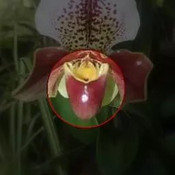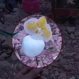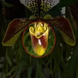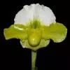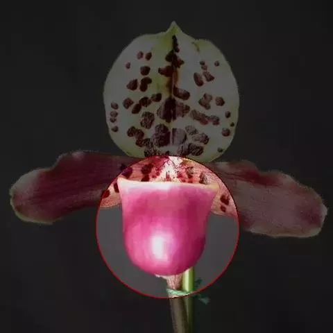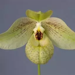 花葶直立,长12-25厘米,紫红色,密生短柔毛,顶端生1花;花苞片披针形,长2-3厘米,多少围抱子房,先端急尖并略有3浅裂,背面有龙骨状突起,沿龙骨状突起被毛,边缘有缘毛;花梗和子房长4-6厘米,被毛;花较大;中萼片与合萼片白色而有绿色粗脉纹,花瓣绿白色或淡黄绿色而有密集的暗栗色斑点或有时有紫褐色晕,唇瓣绿黄色而具暗色脉和淡褐色晕以及栗色小斑点,退化雄蕊淡黄绿色而有深绿色和紫褐色脉纹;中萼片卵形,长4-5厘米,宽2.5-3厘米,先端渐尖,背面常略被毛,边缘具缘毛;合萼片卵状披针形,长3.5-4.5厘米,宽2-2.5厘米,亦略被毛;花瓣近长圆形,长5-6.5厘米,宽约1.5厘米,先端急尖,边缘有长缘毛;唇瓣倒盔状,基部有宽阔的、长1.5-2厘米的柄;囊近长圆状卵形,向末端略变狭,长2.5-3 彩云兜兰 - 全株 厘米,宽约2厘米,囊口极宽阔,两侧各有1个直立的耳,两耳前方的边缘不内折,囊底有毛,囊外表面被小乳突状毛,内弯侧裂片上常有小疣状突起;退化雄蕊倒心状半月形,长约1厘米,宽1.2-1.5厘米,先端有宽阔的湾缺,湾缺中央具短尖。花期12月至次年3月。 [6-7]