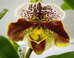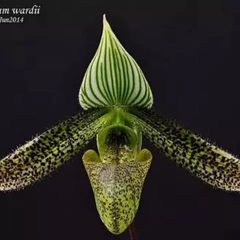 彩云兜兰(学名:Paphiopedilum wardii Summerhayes)是兰科、兜兰属的地生植物,是国家一级保护植物。 地生。叶基生,数枚至多枚,带形、革质。花葶从叶丛中长出,花苞片非叶状;子房顶端常收狭成喙状;花大而艳丽,有种种色泽;中萼直立,花粉粉质或带粘性,退化雄蕊扁平;柱头肥厚,下弯,柱头面有乳突,果实为蒴果。兜兰花比较雅致,色彩比较庄重,色及带有不规则斑点或条纹。花瓣较厚,花朵开放期比较长,12月至次年3月开花。