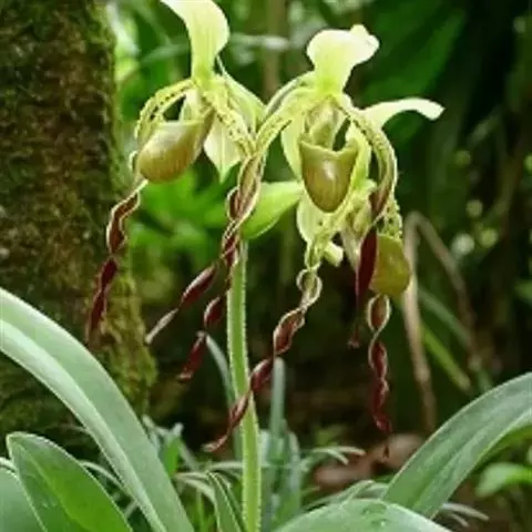 飘带兜兰 Stein)是兰科兜兰属的附生植物,叶基生,叶片宽带形,厚革质,无毛;花葶近直立,绿色,…