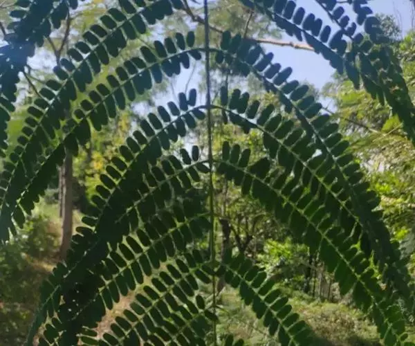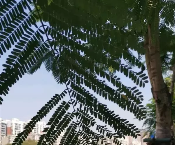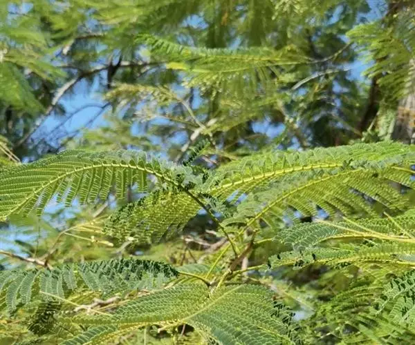 凤凰木叶为二回偶数羽状复叶,长20-60厘米,具托叶;下部的托叶明显地羽状分裂,上部的成刚毛状;叶柄长7-12厘米,光滑至被短柔毛,上面具槽,基部膨大呈垫状;羽片对生,15-20对,长达5-10厘米;小叶25对,密集对生,长圆形,长4-8毫米,宽3-4毫米,两面被绢毛,先端钝,基部偏斜,边全缘;中脉明显;小叶柄短。
