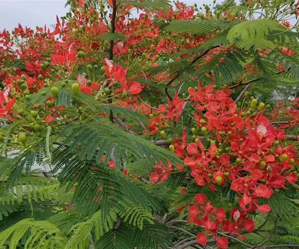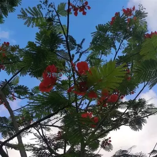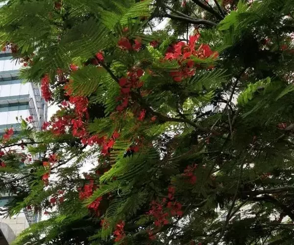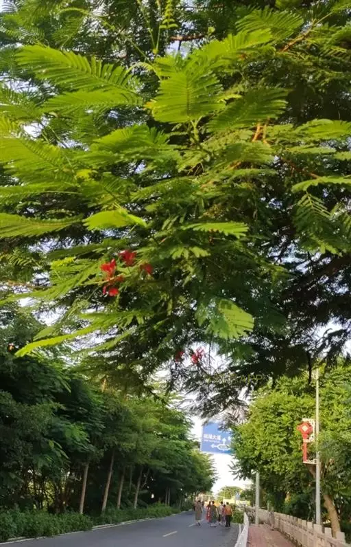 凤凰木(Delonixregia),取名缘于“叶如飞凰之羽,花若丹凤之冠”。花语为:离别、思念、火热青春