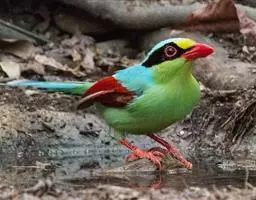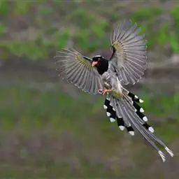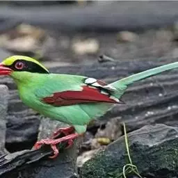 蓝绿鹊:中型鸟类,共有5个亚种。体长36-38厘米。尾长,嘴、脚红色。通体羽色主要为草绿色,…