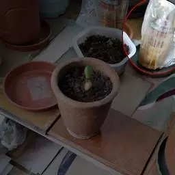 b、入盆前先将花盆洗净,盆底垫上瓦片,装入营养土至盆沿3~4cm为宜。间隔10cm左右挖好5~7cm深的穴。