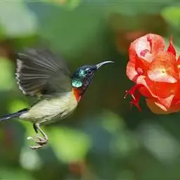 叉尾太阳鸟,雀形目太阳鸟科太阳鸟属留鸟;为小型鸟类,雄鸟头顶辉蓝绿色,上体橄榄绿色,腰明黄色,…