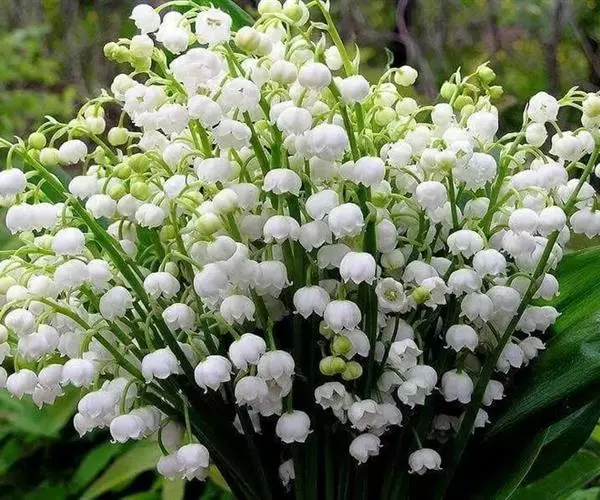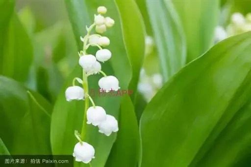 铃兰是多年生草本植物,植株全部无毛,高18-30厘米,常成片生长。叶椭圆形或卵状披针形,长7-20厘米,宽3-8.5厘米,先端近急尖,基部楔形;叶柄长8-20厘米。