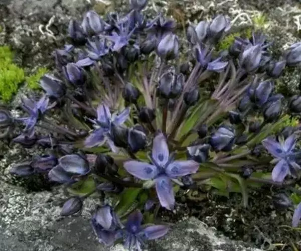 多年生草本,高8-12厘米。根肉质,粗壮,直径5-10毫米。茎多数,丛生,近等长,细瘦,状如总花梗,上部聚伞状分枝。叶大部分基生,莲座状,匙形或矩圆状匙形,长1.5-3.5厘米,宽0.5-1.2厘米,先端圆形或钝,边缘微粗糙,基部渐狭成柄,叶脉3-7条,弧形,较明显;茎生叶极少,苞叶状。聚伞花序生分枝顶端,具1-3(4)花;花梗长2-4.5厘米,不等长;花4数;花萼长为花冠的2/3,裂片矩圆形或披针形,长5-7毫米,先端钝或急尖,边缘粗糙;花冠蓝紫色,裂片矩圆形,长(8)10-11毫米,先端钝,基部具1个椭圆形、周缘具长柔毛状流苏的腺窝;花丝线形,长约5毫米,花药深蓝色,长约2.5毫米。蒴果披针形,长约1.5厘米;种子褐色,近球形,表面平滑。花果期6-9月。