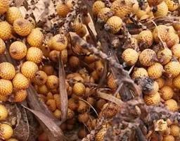 多个花序从顶部叶腋中同时抽出,粗壮,下垂,长1到4米,整个花序轴为许多大的苞片状的佛焰苞包着,每个佛焰苞内着生1个穗状花序,长10-15厘米,雄花着生于上部,雌花着生于基部;雄花较小,长5-8毫米,稍弯曲,雄蕊(6-)9,花丝粗;雌花较长,长约2厘米,花萼浅3齿裂,花冠略长于花萼,分裂成3个半裂的尖裂片。果实椭圆形或倒卵球形,长约6厘米或更长,直径4.2-4.8厘米,被覆瓦状排列的稍凸起的鳞片9纵列,鳞片中央有宽的沟槽,淡褐色,边缘具稍宽的暗褐色的流苏,果顶具短尖的喙。种子卵状长椭圆形,顶端变狭,钝头,长约5.5厘米,直径3-3.5厘米,胚乳嚼烂状,胚侧生于中部。花期3-5月,果期为第三年的3-10月。