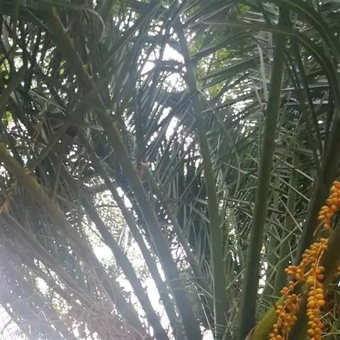 酒椰,茎直立,中等乔木状,高达5-10米。叶为羽状全裂,全长12-13米;羽片线形,长1.2-2米,宽3-5厘米,中脉及边缘具刺,上面绿色,背面灰白色;叶柄粗壮,长达1.5-1.8米,基部边缘成撕裂纤维状。