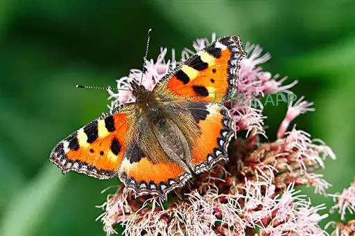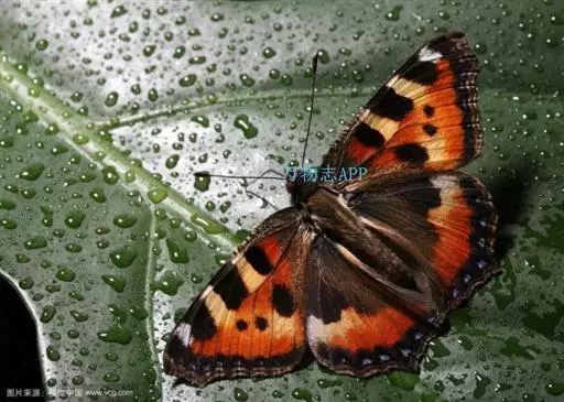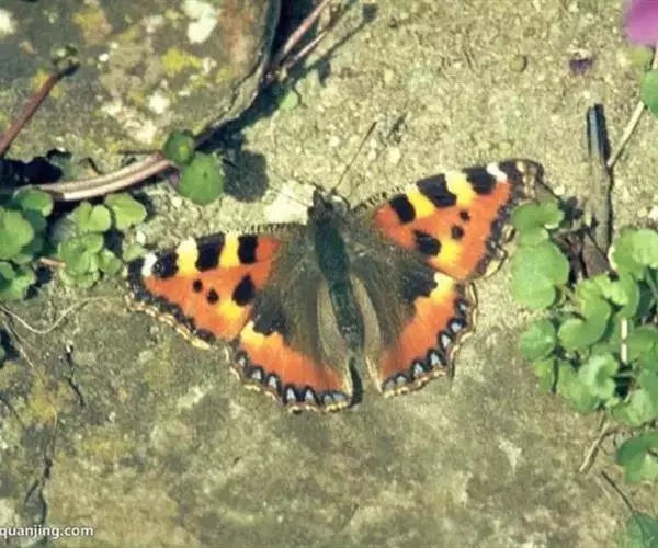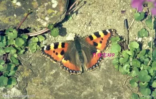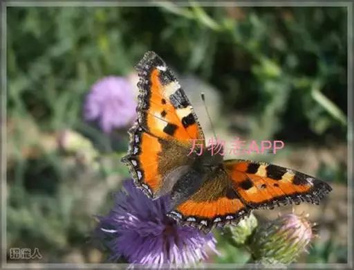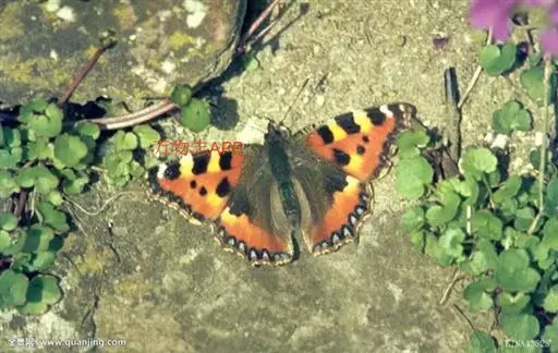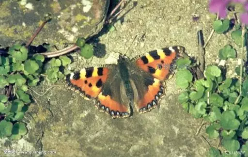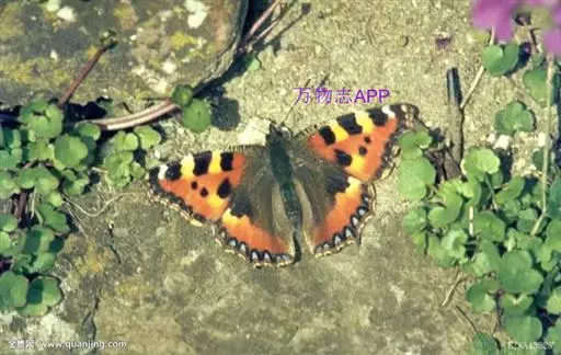 荨麻蛱蝶(学名:Aglais urticae):共有10个亚种。翅展4.5-5厘米。翅面黄褐或红褐色,斑纹黑或黑褐色,前翅外缘齿状,翅端呈镰形,外缘有一黑褐色宽带,顶角内侧有一白斑,中室内外及其下方各有1黑色斑纹。前后翅外缘黑褐色宽带内有7-8个青蓝色斑。翅反面黑褐色,翅中部有一个浅色宽带。幼虫黑色,体背中央及体侧有一条黄色纵带。