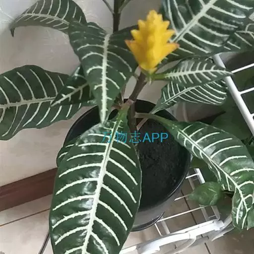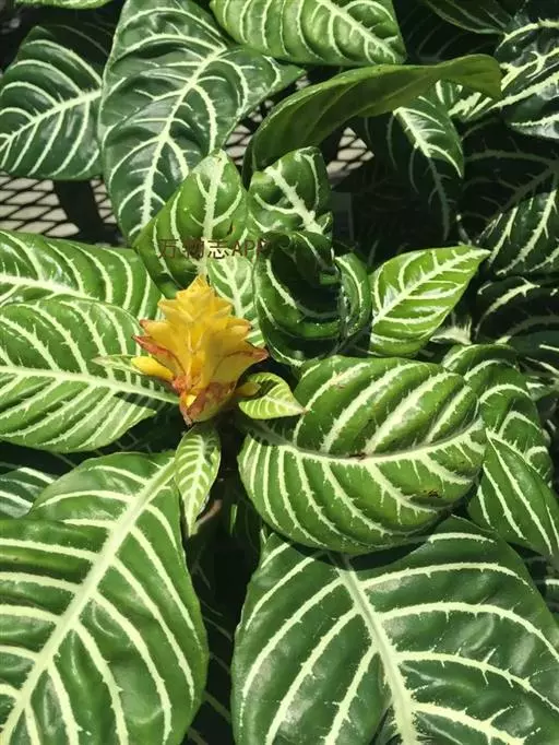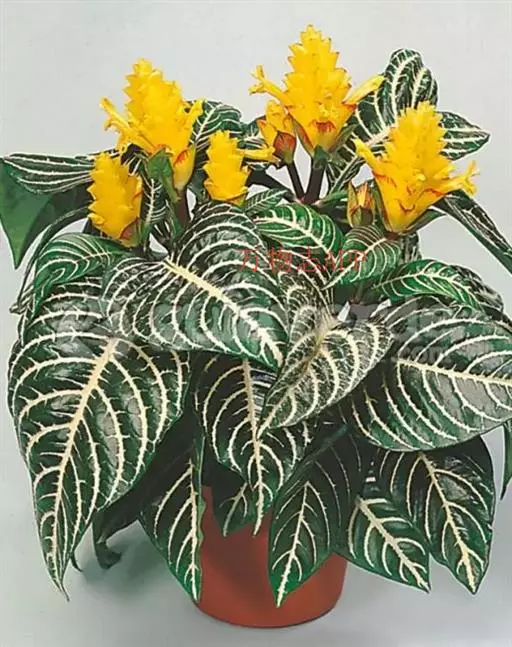 银脉爵床,又名斑马花、斑马爵床,爵床科单药花属多年生常绿草本植物。茎直立、方形、植株粗壮。略带肉质。叶对生。卵形或椭圆状卵形,叶子长约15cm~20cm。宽约10cm;叶端尖,叶片深绿色有光泽,叶面具有明显的白色条纹状叶脉,叶脉、叶缘均有波状起伏。因叶片上的斑纹酷似斑马身上的花纹。穗状花序顶生或腋生,花簇金字塔形,苞片金黄色,十分醒目。有时具红色边缘。交互对列包裹着花梗,如同屋顶瓦片样层层重叠。花双唇形,淡黄色,5个萼片。花期夏秋季,但在适宜的条件下全年都可开放。