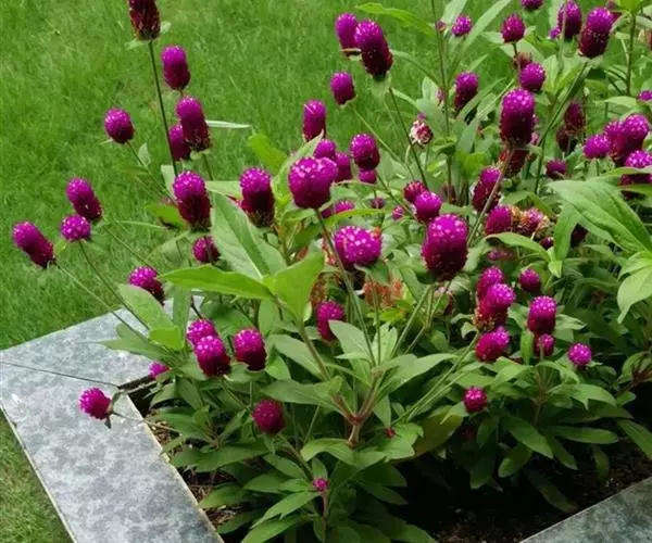千日红 千日红花期长,花色鲜艳,为优良的园林观赏花卉。是花坛、花境的常用材料,且花后不落,色泽不褪,仍保持鲜艳。