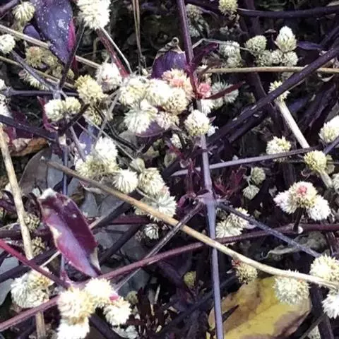 花多数,密生,成顶生球形或矩圆形头状花序,单一或2-3个,直径2-2.5厘米,常紫红色,有时淡紫色或白色;总苞为2绿色对生叶状苞片而成,卵形或心形,长1-1.5厘米,两面有灰色长柔毛;苞片卵形,长3-5毫米,白色,顶端紫红色;小苞片三角状披针形,长1-1.2厘米,紫红色,内面凹陷,项端渐尖,背棱有细锯齿缘;花被片披针形,长5-6毫米,不展开,顶端渐尖,外面密生白色绵毛,花期后不变硬;雄蕊花丝连合成管状,顶端5浅裂,花药生在裂片的内面,微伸出;花柱条形,比雄蕊管短,柱头2,叉状分枝。胞果近球形,直径2-2.5毫米。