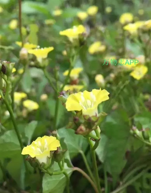 聚伞花序腋生,有3~5朵花,有时更多或偶为单生,花序梗比叶柄粗,长0.8~5厘米,第一次分枝为二歧聚伞式,以后为单歧式;花梗长2~5毫米,连同花序梗均具小疣状突起;小苞片早落;萼片宽倒卵状匙形,或近于长方形,外方2~3.5毫米,内方3~5毫米,无毛,顶端截形,明显具外倾的凸尖;花冠黄色,钟状,长0.8厘米,外面无毛,内面近基部具长柔毛;雄蕊与花冠近等长,花丝下部扩大,疏生长柔毛;子房球形,花柱与花冠近等长,柱头球形。
