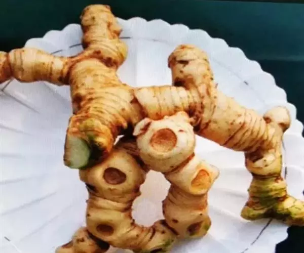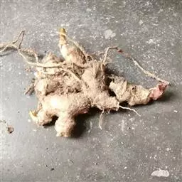2、多花黄精:根茎连珠状或块状,稍带圆柱形,直径2~3cm。每一结节上茎痕明显,圆盘状,直径约1cm。圆柱形处环节明显,有众多须根痕,直径约1mm。表面黄棕色,有细皱纹。质坚实,稍带柔韧,折断面颗粒状,有众多黄棕色维管束小点散列。气微,味微甜。