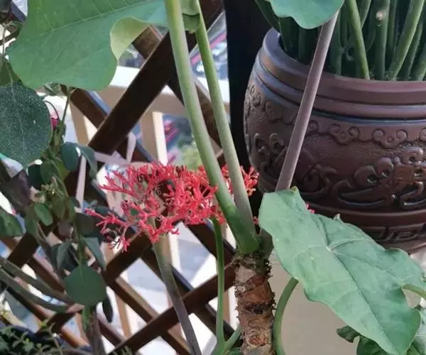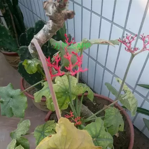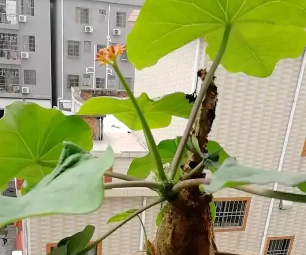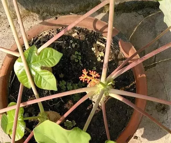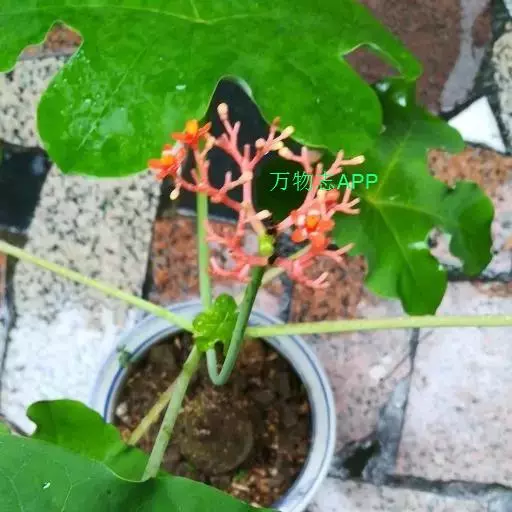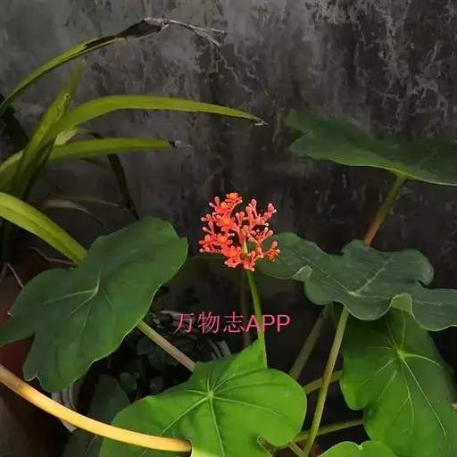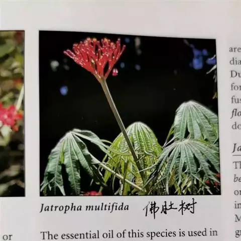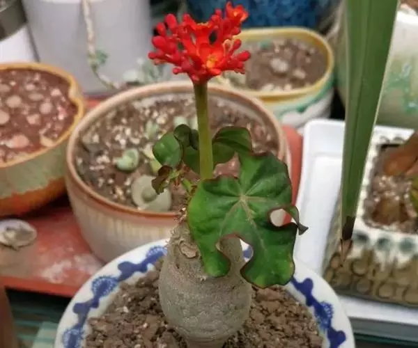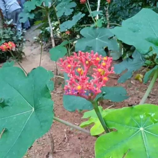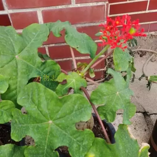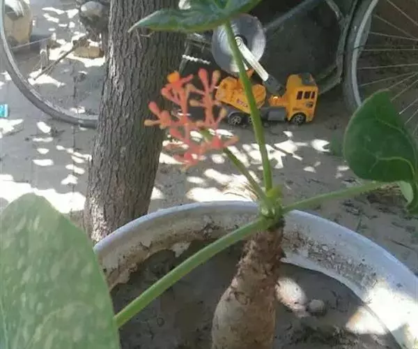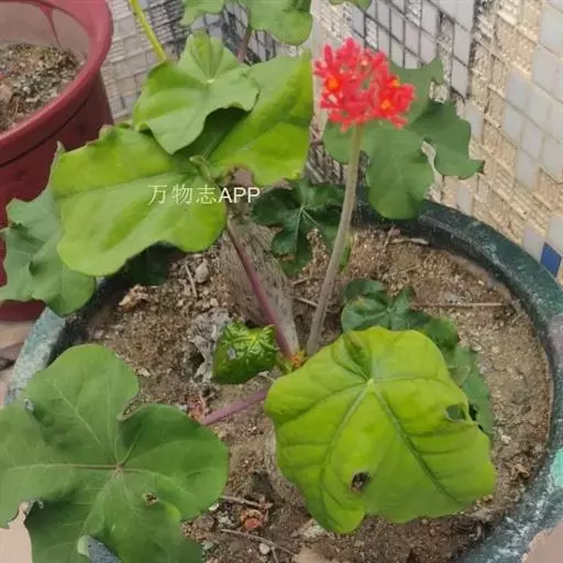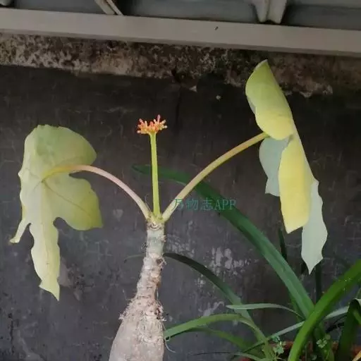 佛肚树(学名:Jatropha podagrica Hook.)是大戟科麻疯树属的肉质灌木,茎基部膨大呈卵圆状棒形,茎端两歧分叉。茎表皮灰色易脱落。叶簇生分枝顶端,绿色,光滑又稍具蜡质白粉。托叶角质分叉,刺状,宿存于茎枝上很长时间。花序长15厘米,重复两歧分叉,花鲜红色。