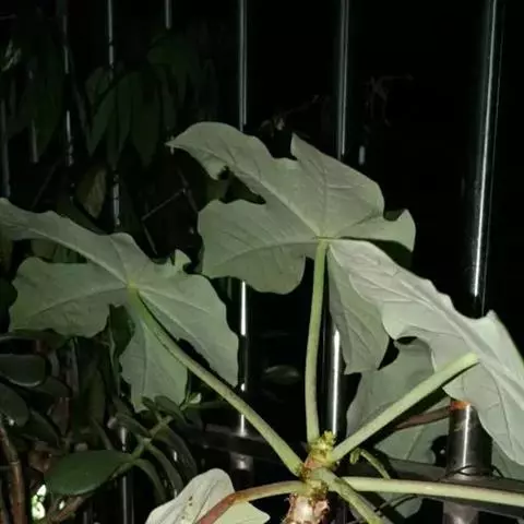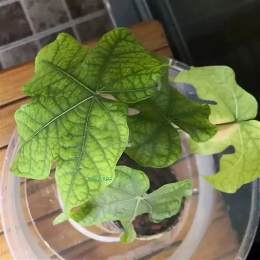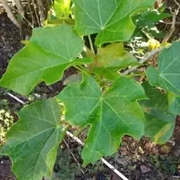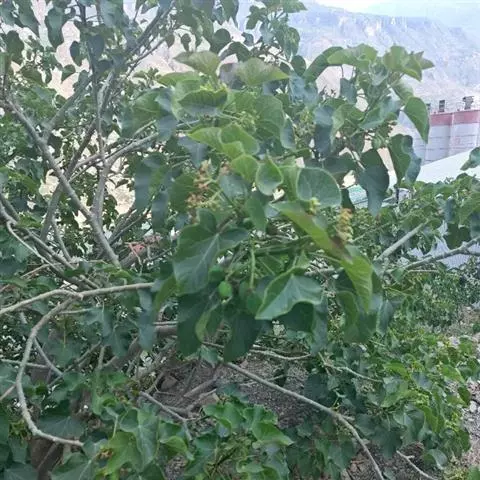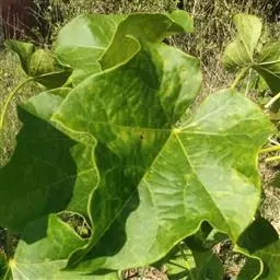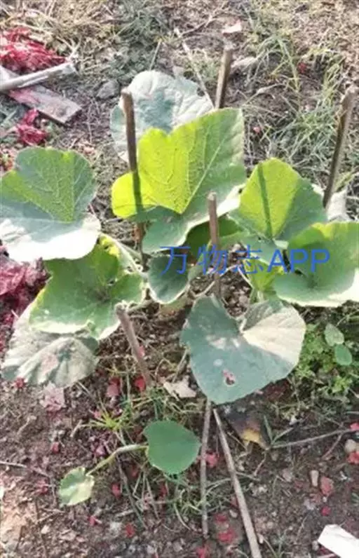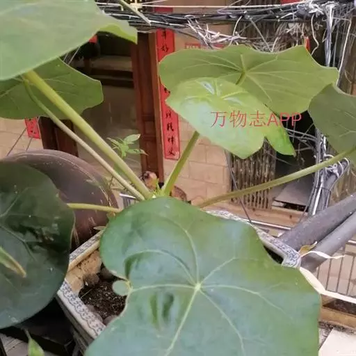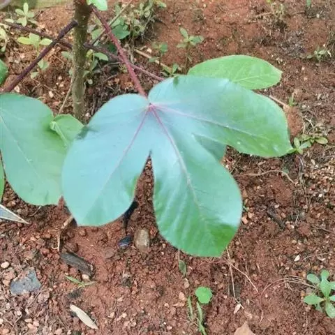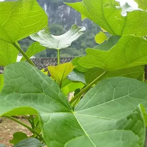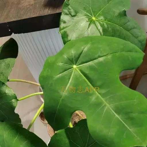 叶盾状着生,轮廓近圆形至阔椭圆形,长8-18厘米,宽6-16厘米,顶端圆钝,基部截形或钝圆,全缘或2-6浅裂,上面亮绿色,下面灰绿色,两面无毛;掌状脉6-8,其中上部3条直达叶缘;叶柄长8-16厘米,无毛;托叶分裂呈刺状,宿存。