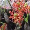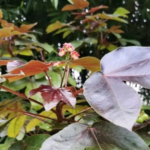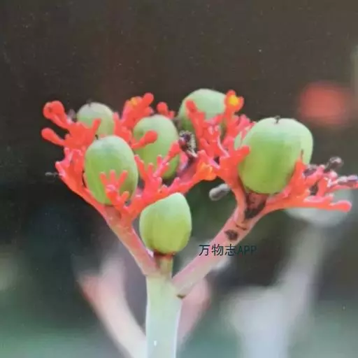 花序顶生,具长总梗,分枝短,红色,花萼长约2毫米,裂片近圆形,长约1毫米;花瓣倒卵状长圆形,长约6毫米,红色;雄花:雄蕊6-8枚,基部合生,花药与花丝近等长;雌花:子房无毛,花柱3枚,基部合生,顶端2裂。蒴果椭圆状,长13-18毫米,直径约15毫米,具3纵沟;种子长约1.1厘米,平滑。花期几全年。