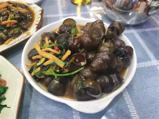 炒田螺 田螺又名香螺,通常生活在池塘、水田、小溪或河沟里。为满足人们需要,这些年来有的地方已发展人工养殖。田螺个体不大,肉不多,其真正的肌肉只是螺口伸出来的头和足,因此在吃田螺时,我们只吃其肉,弃五脏而不吃。