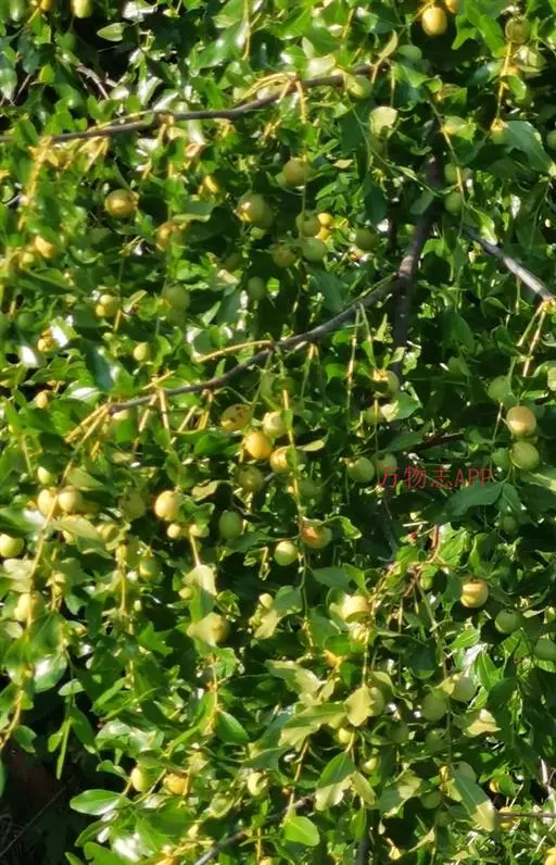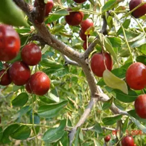 枣(学名:Ziziphus jujuba Mill.),别称枣子,大枣、刺枣,贯枣。鼠李科枣属植物,落叶小乔木,稀灌木,高达10余米,树皮褐色或灰褐色,叶柄长1-6毫米,或在长枝上的可达1厘米,无毛或有疏微毛,托叶刺纤细,后期常脱落。花黄绿色,两性,无毛,具短总花梗,单生或密集成腋生聚伞花序。核果矩圆形或是长卵圆形,长2-3.5厘米,直径1.5-2厘米,成熟后由红色变红紫色,中果皮肉质、厚、味甜。种子扁椭圆形,长约1厘米,宽8毫米。