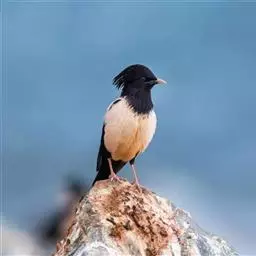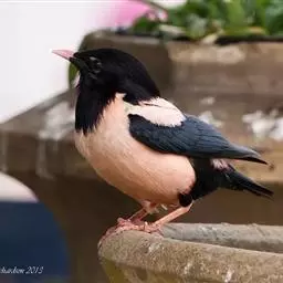 粉红椋鸟是雀形目椋鸟科粉红椋鸟属鸟类。头顶具紫色羽冠;头部、颈、颏、喉黑色具蓝紫色金属光泽;背和腹粉红色;两翅和尾黑褐色;虹膜暗褐色;嘴黄色或粉红色,上嘴基部黑色,冬季嘴为褐色;脚黄色。嘴较其他椋鸟短而钝,上嘴弯曲较明显;脚较粗壮,爪发达。粉红椋鸟分布于欧洲东南部、西伯利亚、西亚、印度和斯里兰卡岛等地区,在中国新疆西部和北部、西藏西部、澳门、台湾等地也能看到其身影。栖息于干旱平原、荒漠或半荒漠地区。常成群活动,鸣声嘈杂。主要在地面觅食,以甲虫、蝗虫、毛虫等各种昆虫为食,偶食植物果实和种子。繁殖期5—7月,营巢于岩壁缝隙、树洞中,每窝产卵4—6枚,卵白色或淡蓝色,孵化期13—15天。雏鸟晚成性,由雌雄亲鸟共同喂养。粉红椋鸟种群数量较少,已被列入中国国家林业局2000年8月1日发布的《国家保护的有益的或者有重要经济、科学研究价值的陆生野生动物名录》。