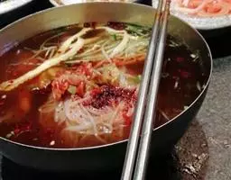 豚骨高汤 适量,肉片 100g,细拉面 150g,罐头玉米粒,海带芽 ,鱼片 10g, 细葱花 适量