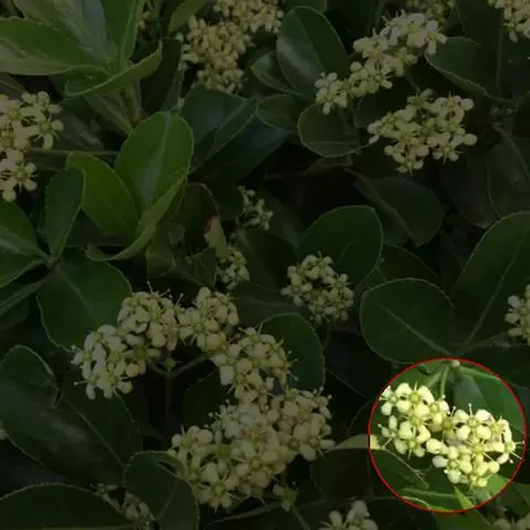 聚伞花序2-3次分枝,有花7-15朵;花序梗长10-15毫米,第一次分枝长2-3毫米,第二次分枝极短或近无;小花梗长达5毫米;花白绿色,直径约8毫米,4数;雄蕊花丝长2-3毫米;花柱短,长1-1.5毫米,柱头圆钝不膨大。蒴果4棱,倒圆心状,长7-9毫米,直径约1厘米,粉红色;种子椭圆状,长5-6毫米,直径3-4毫米,种脐、种皮棕色,假种皮橘红色,包被种子全部。花期7月,果期9-10月。