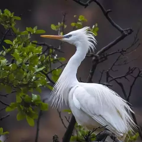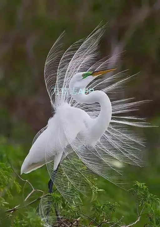 描述:中等体型(60厘米)的白色鹭。与牛背鹭的区别在体型较大而纤瘦,嘴及腿黑色,趾黄色,繁殖羽纯白,颈背具细长饰羽,背及胸具蓑状羽。