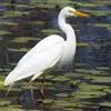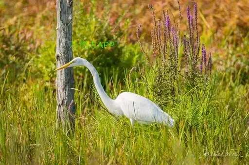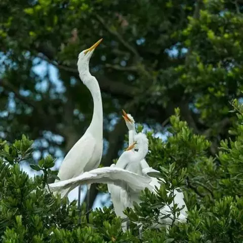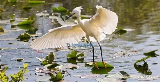 大白鹭 体态纤瘦,乳白色:夏羽的成鸟繁殖时枕部着生两条狭长而软的矛状羽,状若双辫;肩和胸着生蓑羽,冬羽时蓑羽常全部脱落,虹膜黄色;脸的裸露部分黄绿色,嘴黑色,嘴裂处及下嘴基部淡角黄色;胫与脚部黑色,趾呈角黄绿色。通常简称为白鹭。小白鹭场栖息于稻田、沼泽、池塘间,以及海岸浅滩的红树林里。常曲缩一脚于腹下,仅以一脚独立。白天觅食,好食小鱼、蛙、虾及昆虫等。繁殖期3~7月。繁殖时成群,常和其他鹭类在一起,雌雄均参加营巢,次年常到旧巢处重新修葺使用。卵蓝绿色,壳面滑。雌雄共同抱卵。卵23天出雏。